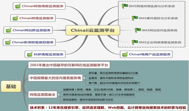 Chinaii云监测平台起源于2001年创立365Agent。后者开创了中国网络情报在线服务时代,成为第一个为企业等机构提供在线情报服务的互联网公司,并于2001年开始为麦当劳、微软、Oracle、红牛、华润、清华大学等机构提供网媒监测服务。