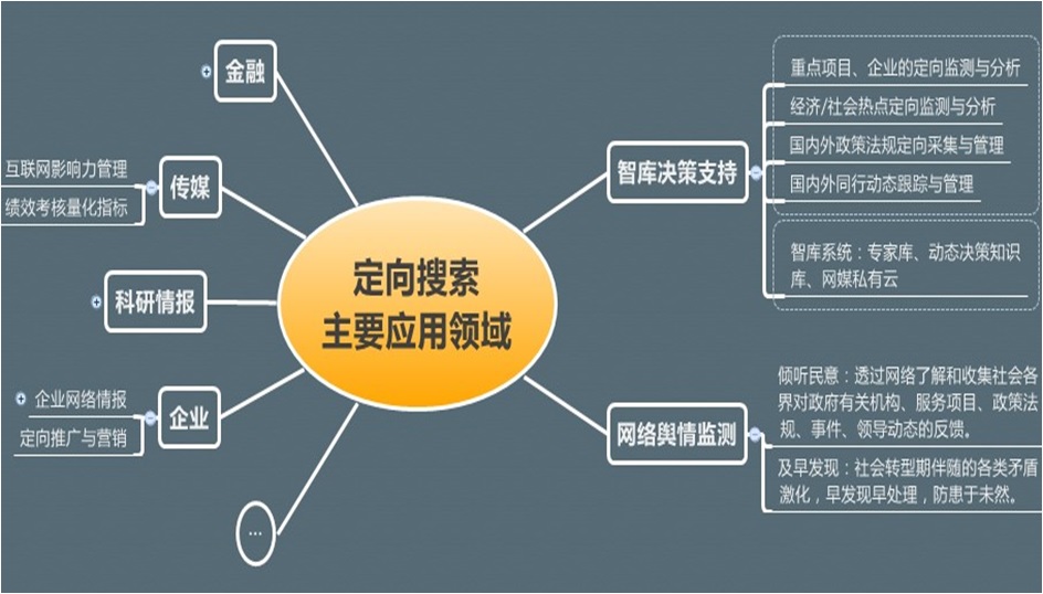 定向搜索云服务模式,通过SaaS模式向各类有特定搜索需求的用户提供搜索服务。目前本服务已经应用于金融(银行、保险、券商、基金等)、传媒、科研、企业、政府舆情、政府智库决策(公共服务)等领域。