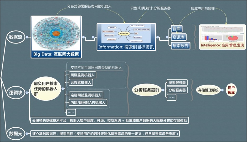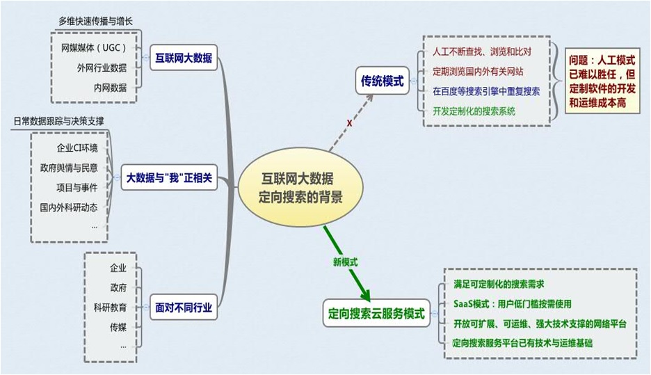 这种定向搜索技术架构,适用于个性化、智能化的大数据监测需求,如舆情监测、企业网络情报监测、特定目标(网站、事件、事物等)跟踪等,以及突发事件或专题的大规模实时搜索。从商业运用上,定向搜索模式更适合于云计算的服务模式(SaaS模式)。用户可以按需搜索、按次数付费。