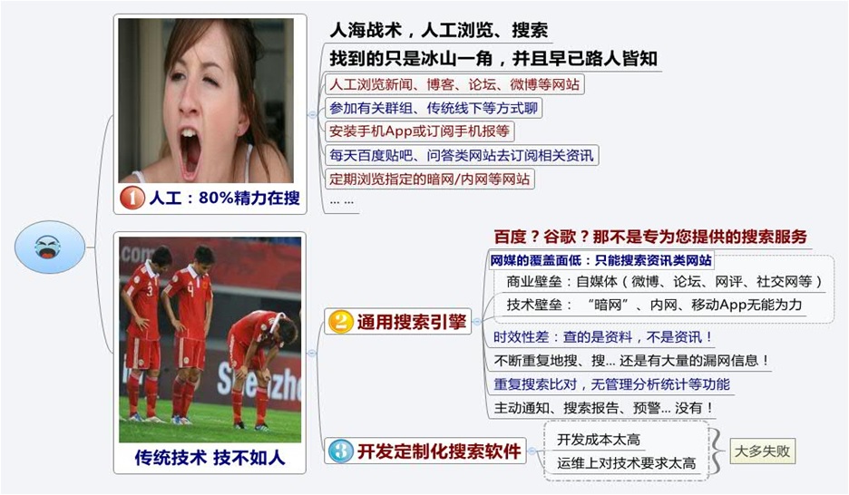 3、开发定制化的搜索软件。这个模式一般能解决用户初期的大部分问题,但除了开发成本的高企之外,还存在软件运维和升级的巨大问题:由于网络环境的多变性,系统的运维升级很难,导致系统的有效运行期一般较短,这也是传统网络型软件的硬伤;这个技术路线要求用户在本地镜像监测网站群的数据,这种模式不具备持续性,也不符合互联网和大数据的发展趋势。